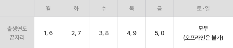 - *온·오프라인 신청 모두 시행 첫 주 (7월 21~25일)에는 출생연도 끝자리 기준 '요일제'가 적용됩니다.