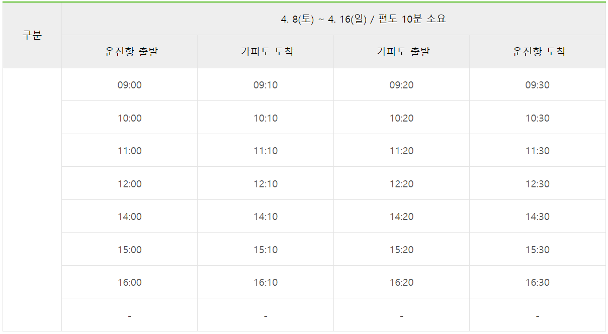 - 운항요금(왕복) : 성인 13,100원 / 청소년 12,900원 / 소인 6,600원