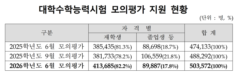 2026학년도 6월 모의평가 접수자 수가 무려 50만 3572명에 달하며, 이는 지난해 대비 약 3만 명 가까이 증가한 수치입니다. 특히 졸업생 수험생만 9만 명에 육박해 역대 최고치를 경신했습니다. 이는 단순한 수치 증가를 넘어, ‘재도전’과 ‘반수’ 열풍을 시사하는 신호입니다.